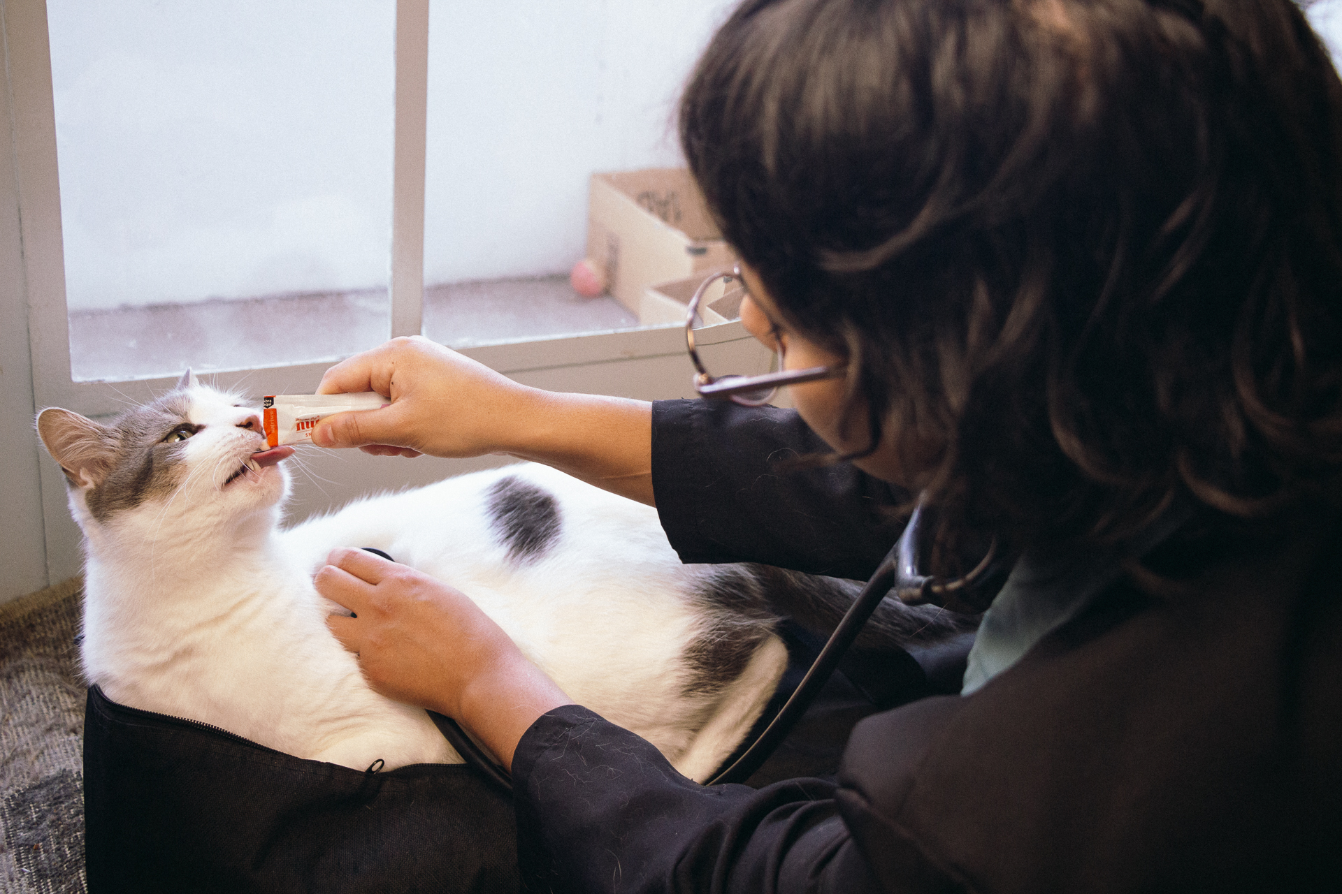 Atualmente, atuo exclusivamente como médica veterinária volante em clínicas parceiras e em atendimentos domiciliares, com foco na medicina felina.